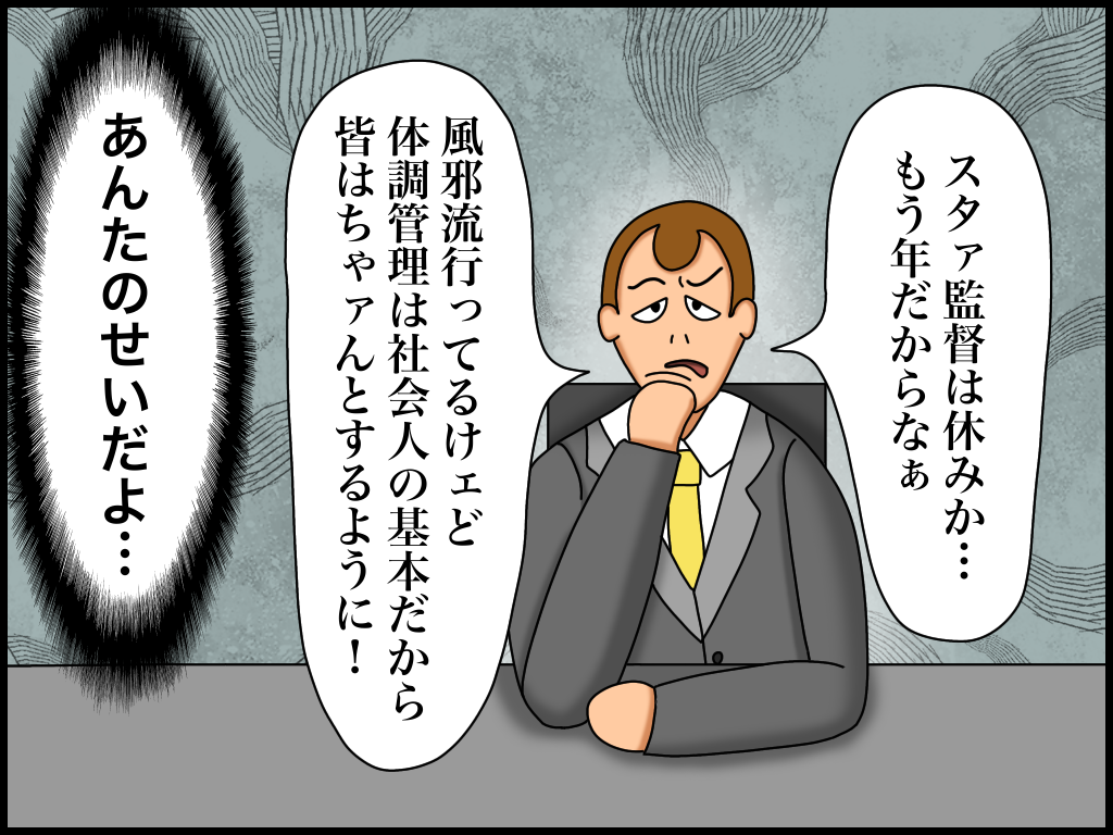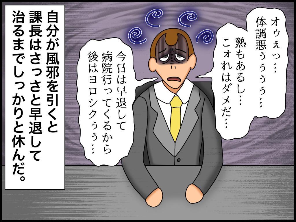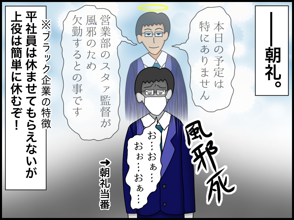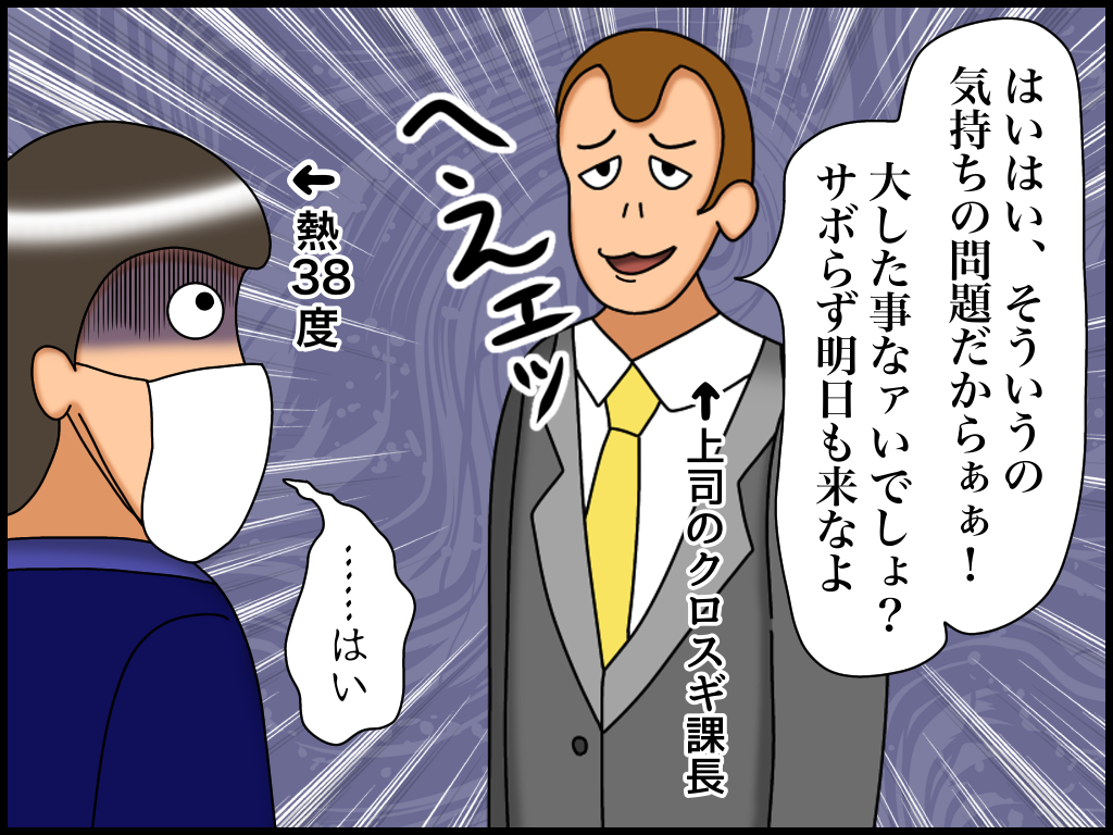会社で風邪が流行った悲劇 2022年01月20日 20:30 とあるブラック企業で働いていた時のお話です。※新型コロナよりずっと前の頃です(念のため遅刻NGで、病院にすら行けなかったので新人達は市販薬や栄養ドリンクだけで治した。↓↓ブログランキングに参加中です↓↓ よかったら押していってねにほんブログ村絵日記ランキング 「ブラック企業編」カテゴリの最新記事 タグ :#一人召された < 前の記事次の記事 > コメント コメント一覧 (4) 1. ん 2022年01月20日 23:28 もはや、風邪を流行らせようとしてるとしか思えませんね😳 0 たっく がしました 2. ‼️ 2022年01月21日 08:34 今時こんな人いるんだ… インフルエンザは学校でさえ 5日間出席停止措置なのに 社会に出るともっと辛いとよく 脅されるけど こんな理不尽さを覚悟しろって事なら 引きこもりも増えるはずだなぁ なんか元々は普通の人たちだったのに いつのまにかこうなったのか 何の因果かここに集まってしまったのだと 思いたい 0 たっく がしました 3. たっく 2022年01月22日 11:38 >>んさん 今にして思うと「この会社、わざとやってるだろ!」って思えちゃいます 笑 0 たっく がしました 4. たっく 2022年01月22日 11:45 >>‼️さん 悪い意味で古い体制が染みついてる会社でした。 今の時代はどんどん淘汰されているはずなので こういう会社は少なくなってるのでは…と思いたいですね。 0 たっく がしました コメントフォーム 名前 コメント 記事の評価 リセット リセット 顔 星 情報を記憶 コメントを投稿する