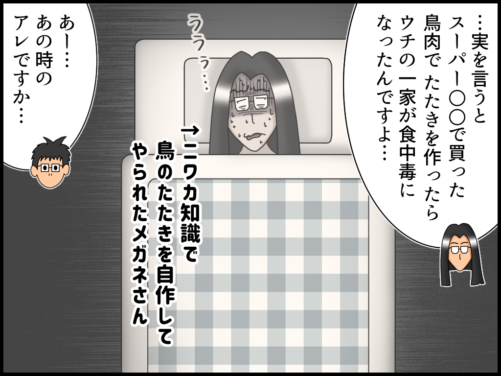 いちゃもんをつける上司【2】 2022年10月27日 20:30 とある会社で私の上司だった「メガネさん」のお話です。※前回の話はこちらから! 迷惑過ぎだろ、メガネ一家。ちなみにメガネマザーには会ったことがないので完全に想像図です。※続きの話はこちら! ※話に出てきた「鳥のたたき事件」はこちらから ↓↓ブログランキングに参加中です↓↓ よかったら押していってねにほんブログ村絵日記ランキング 「いちゃもんをつける上司」カテゴリの最新記事 タグ :#いちゃもん破門#漫画#絵日記 < 前の記事次の記事 > コメント コメント一覧 (4) 1. ん 2022年10月27日 20:42 ついにメガネさんマザーが!!😆 0 たっく がしました 2. 羽生 2022年10月27日 21:24 クレーマーって案外身近に居ますからね(;´Д`) しかしお店も災難ですね(;´Д`) 加熱用を生で食べてのクレームとか やからでしかない(;´Д`) 0 たっく がしました 3. たっく 2022年10月28日 20:05 >>んさん メガマザ、出てきました! 笑 0 たっく がしました 4. たっく 2022年10月28日 20:06 >>羽生さん ものっすごい身近にいました 笑 お店としてはホントいい迷惑だと思います… 0 たっく がしました コメントフォーム 名前 コメント 記事の評価 リセット リセット 顔 星 情報を記憶 コメントを投稿する