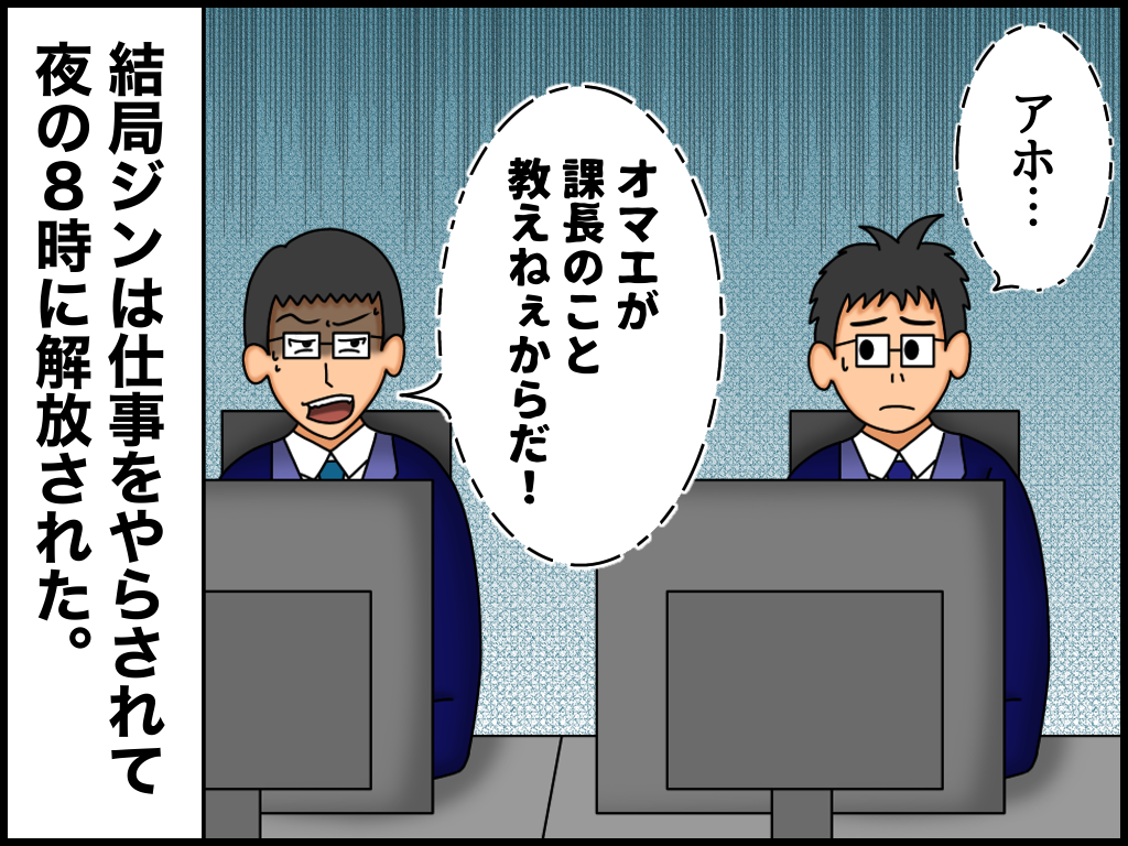 調子に乗った同僚の悲劇【7】終 2023年02月23日 22:05 ブラック企業で一緒に働く同僚「ジン」のお話です。※前回の話はこちらから! ちくわはねぇだろ。私はシフトなので、次の日は振休ですがジンは普通に出社です。かわいそうに。↓↓ブログランキングに参加中です↓↓ よかったら押していってねにほんブログ村絵日記ランキング 「ブラック企業編」カテゴリの最新記事 タグ :#評価が下がりまくる同期#漫画#絵日記 < 前の記事次の記事 > コメント コメント一覧 (2) 1. 羽生 2023年02月24日 05:25 一番悲しい結末ですね(;´Д`) まさに藪をつついて蛇を出す的な 感じの結末ですね(笑)(笑) 0 たっく がしました 2. たっく 2023年02月24日 11:48 >>羽生さん 同僚を信じられなくなって、このような結末に…笑 0 たっく がしました コメントフォーム 名前 コメント 記事の評価 リセット リセット 顔 星 情報を記憶 コメントを投稿する