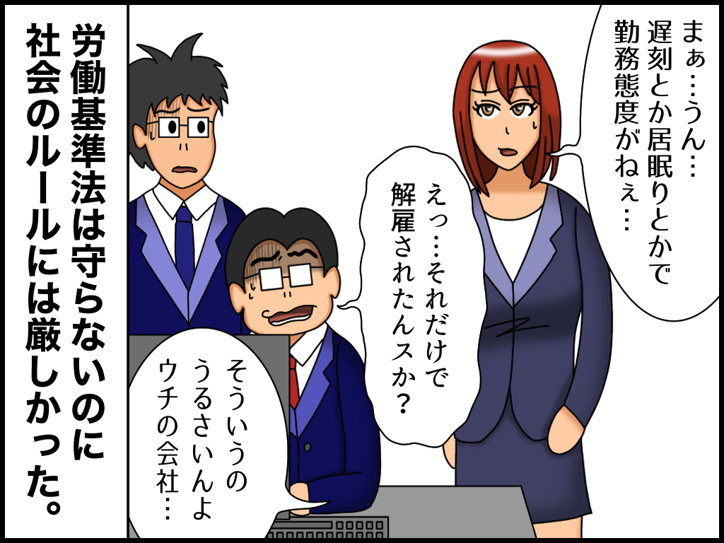 運命の日、来たる【2】 2023年02月26日 20:30 とあるブラック企業で働いていた時のお話です。※前回の話はこちらから! 遅刻…居眠り………居眠り…?どこかで聞いたような…?※続きの話はこちら! ↓↓ブログランキングに参加中です↓↓ よかったら押していってねにほんブログ村絵日記ランキング 「ブラック企業編」カテゴリの最新記事 タグ :#理不尽な社訓#漫画#絵日記 < 前の記事次の記事 > コメント コメント一覧 (4) 1. ん 2023年02月26日 20:46 あ…😨 0 たっく がしました 2. 羽生 2023年02月26日 21:30 居眠りなのは アウトなの一名居ますね(笑) しかし 労基法を完全無視してるヤバい会社ほど 社会のルールに厳しいのはあるあるですよね(;´Д`) あれ何なんですかね? 人員的に労基法無視しないと仕事にならんとか その手の事ならまだ解るんですが 無視してる会社は基本、完全無視が多いですし(;´Д`) 0 たっく がしました 3. たっく 2023年02月27日 12:56 >>んさん 同期に…居眠りのプロが… 笑 0 たっく がしました 4. たっく 2023年02月27日 12:58 >>羽生さん 推測ですが「他人に厳しく、自分に甘く」の 会社バージョンなんだと思います 笑 0 たっく がしました コメントフォーム 名前 コメント 記事の評価 リセット リセット 顔 星 情報を記憶 コメントを投稿する