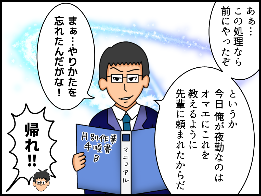 何しに来たって言いたい【ひとコマ話】 2023年03月24日 20:30 体調不良なので…今日はひとコマ話です。ごめんなさい。ブラック企業で一緒に働く同僚「ジン」のお話です。前回の話の続き。立ったまま寝るジンを起こして作業した覚えがあるか聞いてみたら……得意げな顔でポンコツな答えを返してきました。↓↓ブログランキングに参加中です↓↓ よかったら押していってねにほんブログ村絵日記ランキング 「ブラック企業編」カテゴリの最新記事 タグ :#まじかえれ#漫画#絵日記 < 前の記事次の記事 > コメント コメント一覧 (2) 1. 羽生 2023年03月24日 21:38 面白い(笑) しかし潔い この後怒られるんですかね?(笑) 0 たっく がしました 2. たっく 2023年03月25日 11:08 >>羽生さん 二人で四苦八苦しながら作業して、何とかなりました 笑 0 たっく がしました コメントフォーム 名前 コメント 記事の評価 リセット リセット 顔 星 情報を記憶 コメントを投稿する