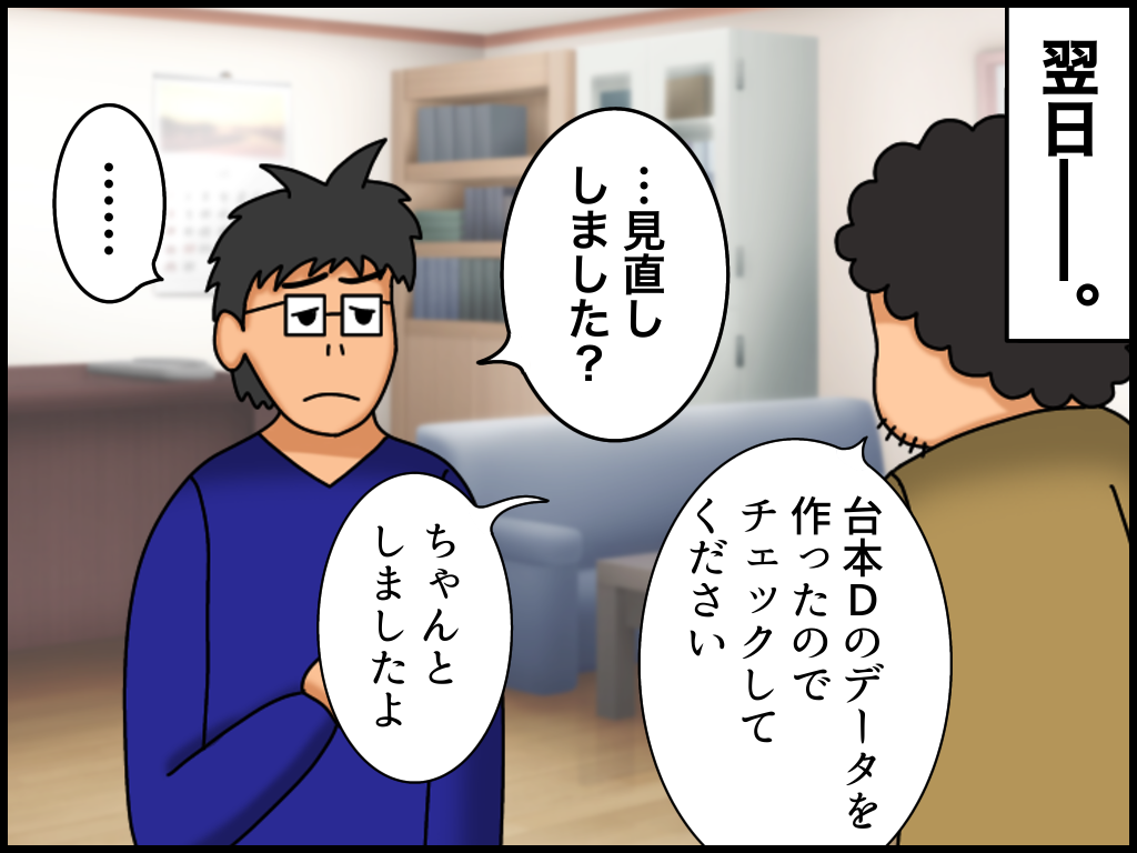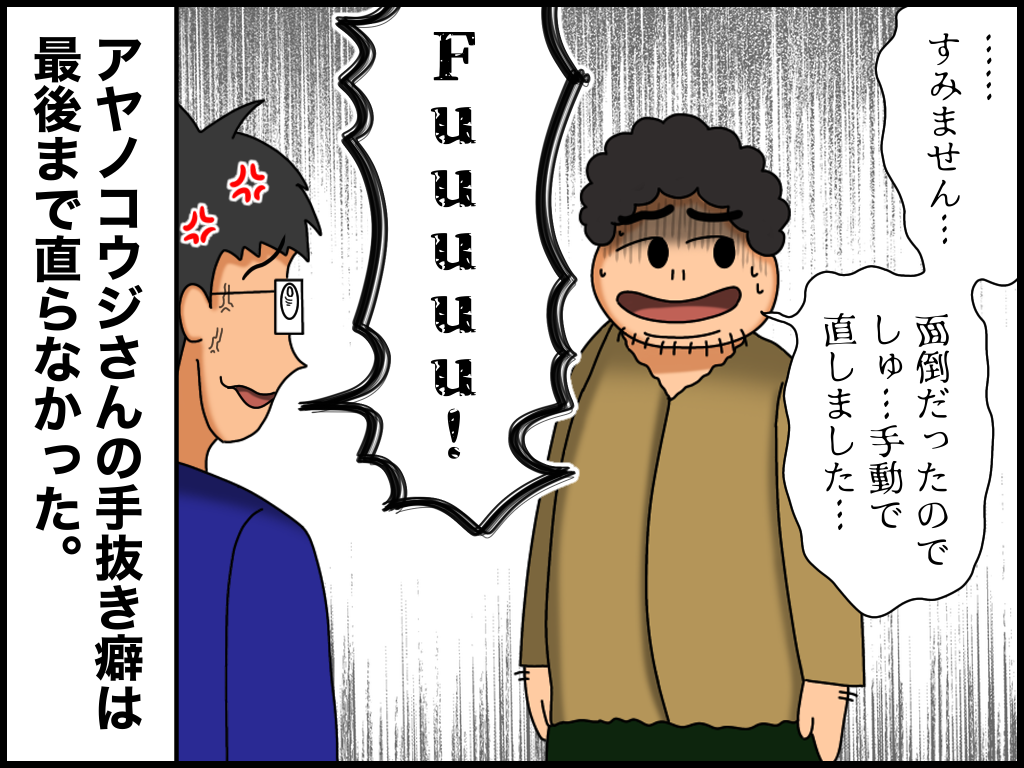 入力ミスが異常に多い上司【5】終 2023年04月03日 20:30 とある会社で私の上司だった「アヤノコウジさん」のお話です。※前回の話はこちらから! こんなの繰り返されたらそらテンションもおかしくなるわ!見直さないのも困るんだけど仕事でウソをつかれるのが一番困る。↓↓ブログランキングに参加中です↓↓ よかったら押していってねにほんブログ村絵日記ランキング 「よろず屋編」カテゴリの最新記事 タグ :#横着の概念が具現化した者#漫画#絵日記 < 前の記事次の記事 > コメント コメント一覧 (6) 1. 羽生 2023年04月03日 21:08 前に働いてた土方で一緒に働いてた人で 社長や仕事の現場リーダーが 全員右向け右‼️と言ったら 1人だけ必ず左向くやつおって それが1度2度とかでなく 毎回、しかも重要度が高くなれば 必ず言ったことの逆をする人おって ムカついたりしてたので パートナー組むとき 邪魔太郎(仮名)みたいなあだ名つけて 呼んでたのですが その人に感覚似てる(;´Д`) まぁその人元々わたしが土方するまで 劣悪な環境の中仕事してたのですが 私が入ってクッションが出来たので 私と言う微温湯に8年浸かってたら 私が辞めた時、劣悪に戻ったらしく 速攻で辞める事になったらしいですが 人としてヤバイな(;´Д`)とか思ってました(笑) 0 たっく がしました 2. ジーザス 2023年04月03日 21:43 おお、クレイジー……! 0 たっく がしました 3. ん 2023年04月03日 22:34 アヤノコウジさんが腹立つ顔してる!笑 地獄の無限ループ 0 たっく がしました 4. たっく 2023年04月04日 18:18 >>羽生さん 会社があると一人か二人か、そういう人はいるんですかね 笑 クッション役…おつかれさまでした! 0 たっく がしました 5. たっく 2023年04月04日 18:19 >>ジーザスさん アヤノコウジさんと仕事してると狂っていきます 笑 0 たっく がしました 6. たっく 2023年04月04日 18:19 >>んさん 反省の色なしって感じですからね~ とりあえずその場しのぎで謝っておこうみたいな 笑 0 たっく がしました コメントフォーム 名前 コメント 記事の評価 リセット リセット 顔 星 情報を記憶 コメントを投稿する