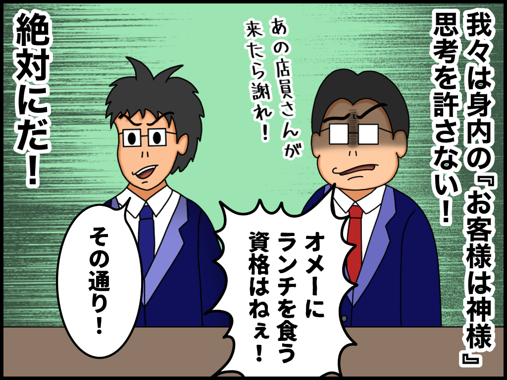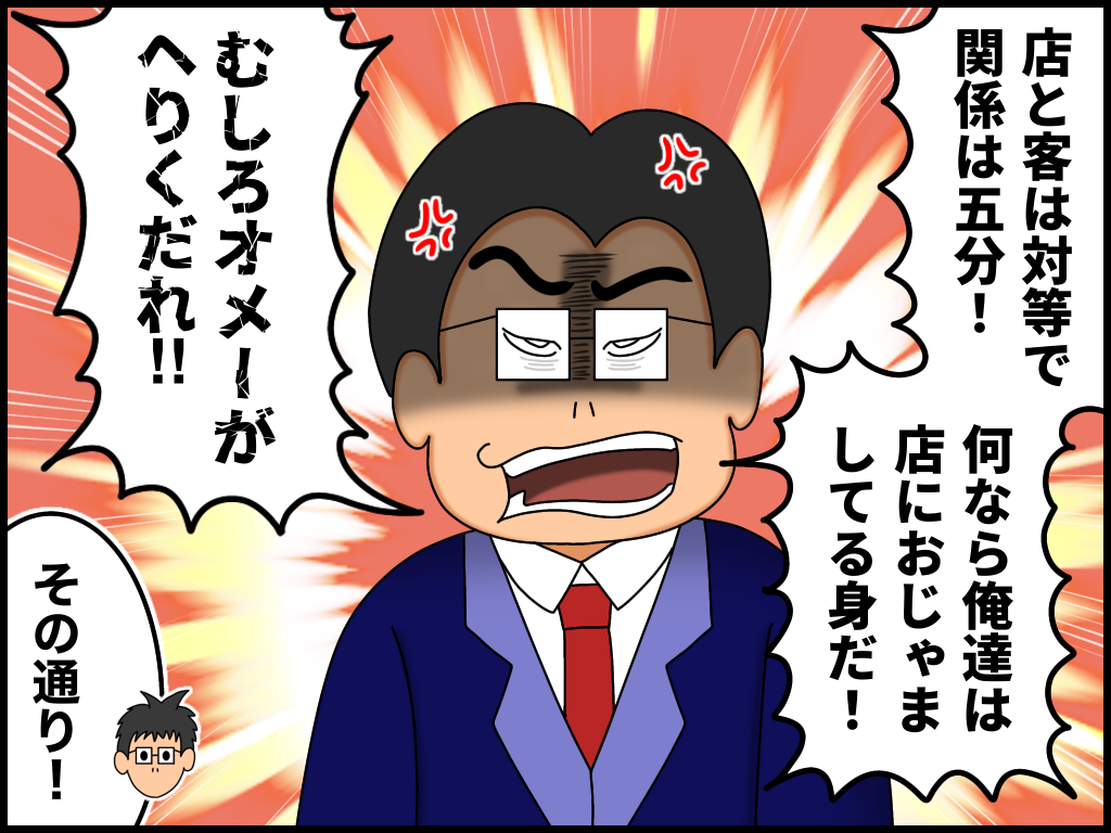 『お客様は神様』な考え方は許さない 2023年04月15日 22:20 とあるブラック企業で働いていた時のお話です。ナカオは無遠慮かつ未成年で喫煙するくらいには粋がってたので店員さんにも横柄な態度でした。一方で、スギウラさんは普段は温厚なんですが昼メシに命を賭けている人だったのでこういう時はめっちゃ怒ってました。ところで私…「その通り」しか言ってなくない?↓↓ブログランキングに参加中です↓↓ よかったら押していってねにほんブログ村絵日記ランキング 「ブラック企業編」カテゴリの最新記事 タグ :#厚顔タマネギ#漫画#絵日記 < 前の記事次の記事 > コメント コメント一覧 (10) 1. 羽生 2023年04月15日 22:37 元々飲食店勤務ですが 横暴な客は神様は神様でも 色々な種類の神がいるからねとか思いながら 対応してました(笑) そして客の立場でも 横暴な店員や店の営業は嫌いで 個人的な感覚ですが お客は料理と接客に対等と思う 店が設定した対価を払うから それに見合った接客を受ける権利があり そして店は客が頼む料理をつくる そしてそれに見合った接客をするから 対価をもらう権利があると思うから そのパワーバランスが崩れると すごく不快になります(;´Д`) 過度な接客や横暴な接客も嫌だし 過度なサービスを要求するのも嫌になる 失敗や不備はあるとしても お互い気持ちの良い間柄で居たいですよね😃 0 たっく がしました 2. ん 2023年04月15日 22:40 たっくさんオウムみたいになってますね笑 店員さんに偉そうな人、めちゃめちゃ苦手です! 0 たっく がしました 3. なんやかんや言うても 2023年04月16日 00:24 典型的なカスタマーハラスメントですよね。 若かりし頃のナカオは見栄っ張りで、少しでも年長者に見られたかったのでしょう。 だから自分を「オヤジ」と新人仲間に呼ばせたりした。 今は、さすがに落ち着いた性格に成長していることを願います。 0 たっく がしました 4. DEN 2023年04月16日 10:03 その通り! その通り! その通り! 0 たっく がしました 5. たっく 2023年04月16日 13:05 >>羽生さん ほんと、ケースバイケースってやつですよね~ お互いに思いやりをもって接したいですね! 0 たっく がしました 6. たっく 2023年04月16日 13:09 >>んさん 歌舞伎とかで合いの手を入れる人みたいになってました 笑 店員さんに偉そうにする人、イヤですよねぇ~… 0 たっく がしました 7. たっく 2023年04月16日 13:11 >>なんやかんや言うてもさん ナカオは若い人がやっちゃう特有の粋がり方をしてましたねぇ 成長してくれてるといいのですが 笑 0 たっく がしました 8. たっく 2023年04月16日 13:12 >>DENさん ほんと「その通り」ばっかりでした 笑 0 たっく がしました 9. こじ 2023年04月22日 01:22 私も店員さんに横柄な態度を取る方が苦手です😞💦カッコ悪いな〜😒とも思います! スギウラさんちゃんと店員さんに謝罪していて素敵ですね✨ 本当にその通り!ですよね😆❗️ 0 たっく がしました 10. たっく 2023年04月22日 13:37 >>こじさん 店員さんには常識を持って接したいですよね~ ホント「その通り」しか出てこなかったです 笑 0 たっく がしました コメントフォーム 名前 コメント 記事の評価 リセット リセット 顔 星 情報を記憶 コメントを投稿する